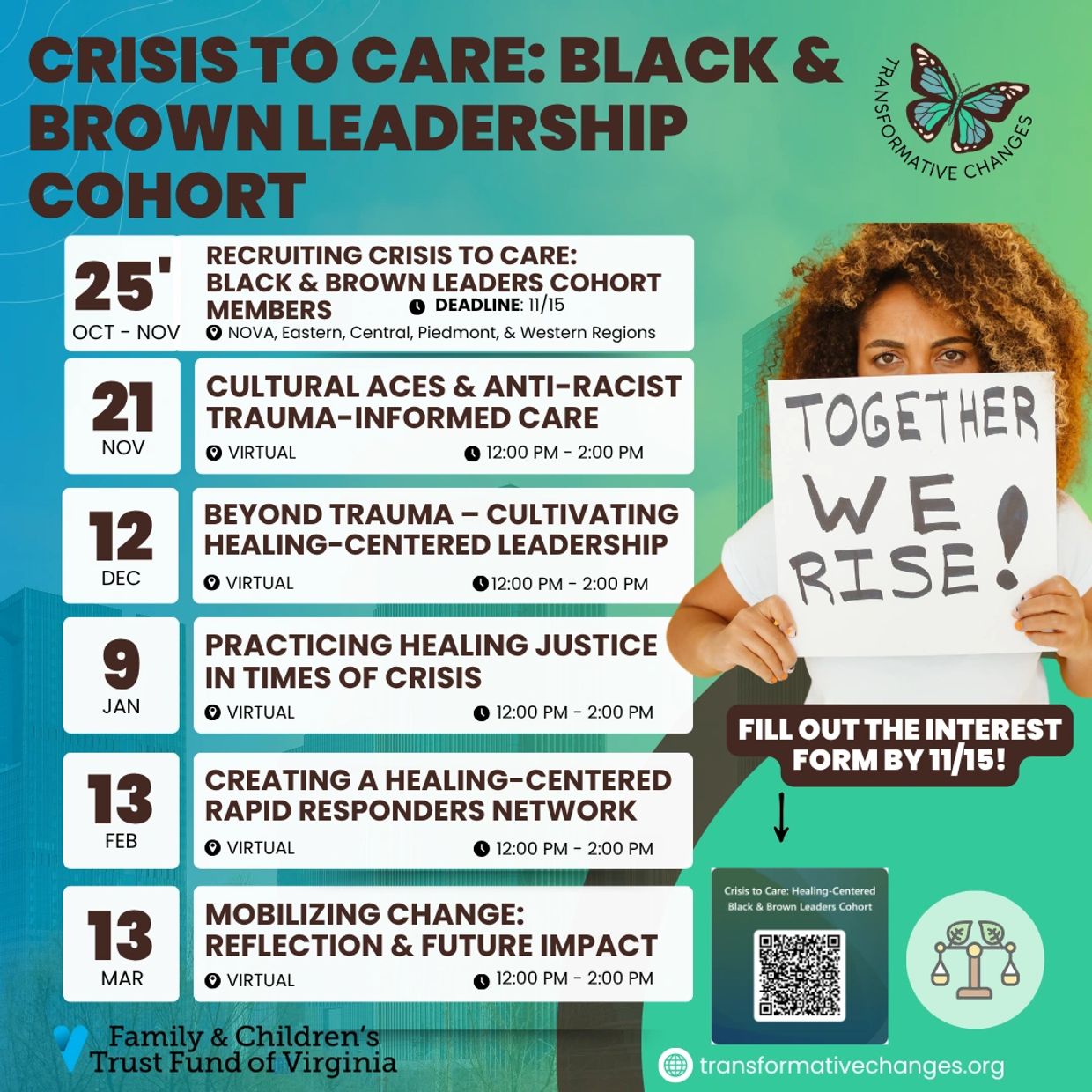 We’re inviting 15 Black and Brown leaders to join a six-month healing justice leadership cohort (Nov 2025 – Mar 2026) across Virginia’s five VDSS regions. You’ll be part of a movement to create community-based alternatives to punitive crisis systems or saviorship.
